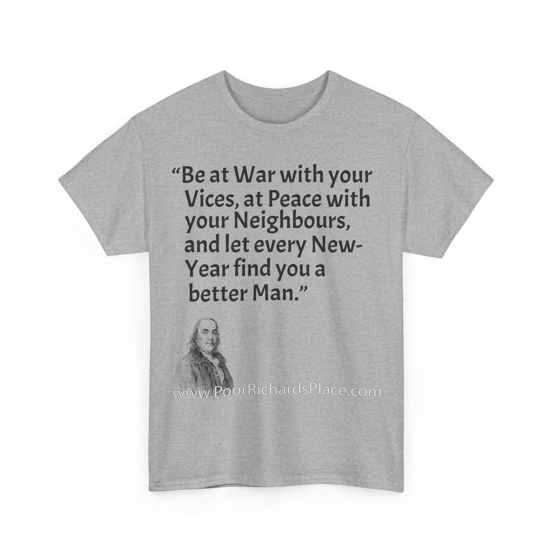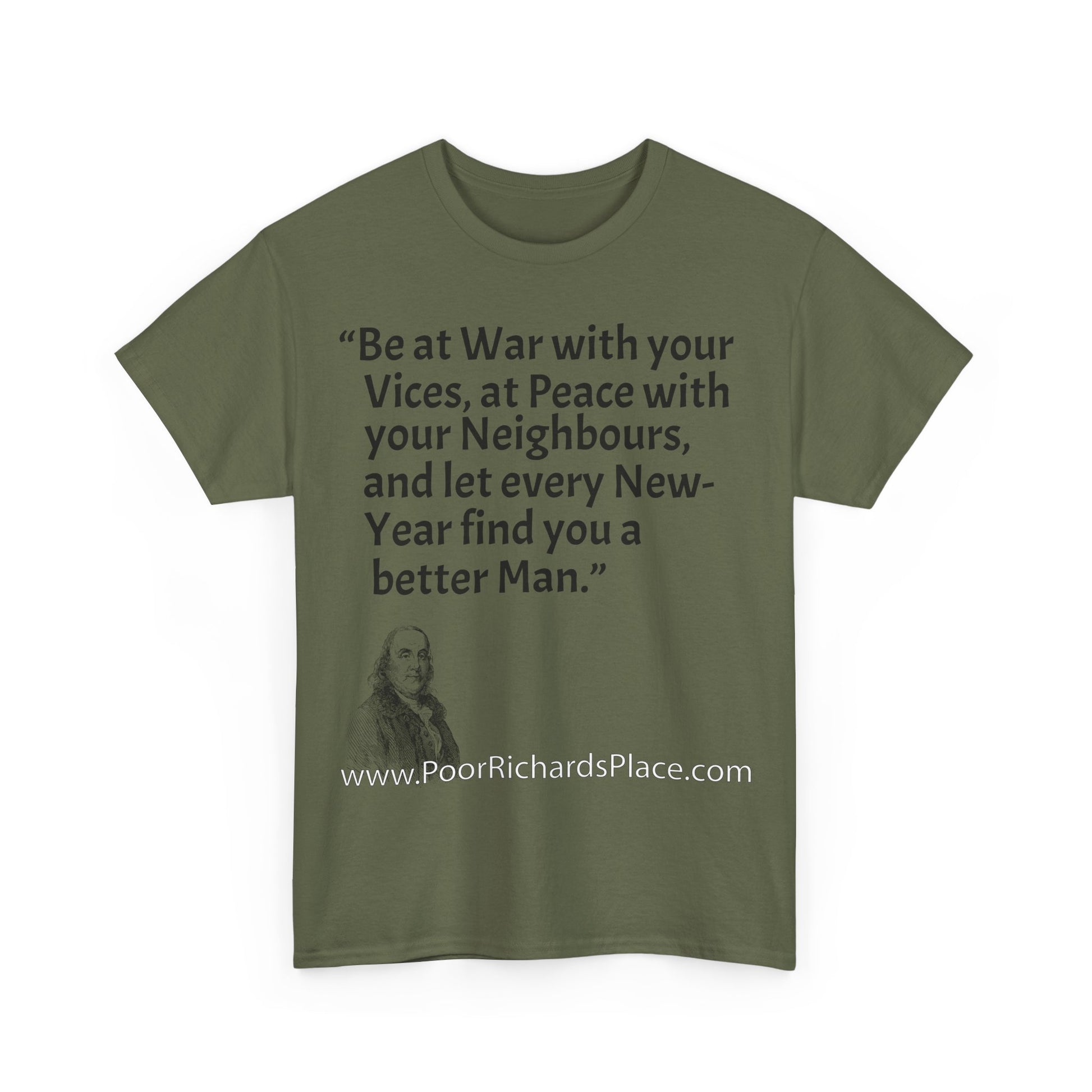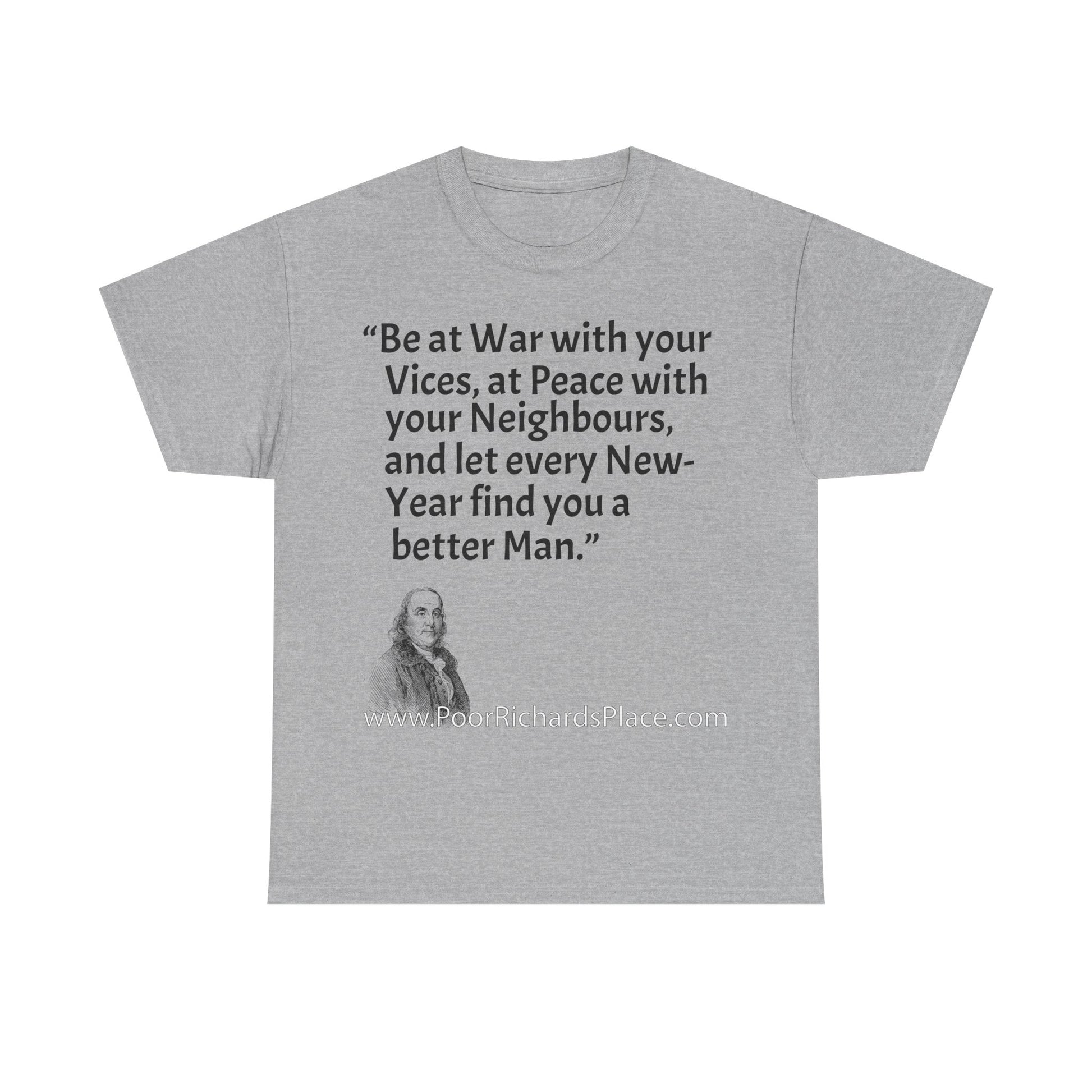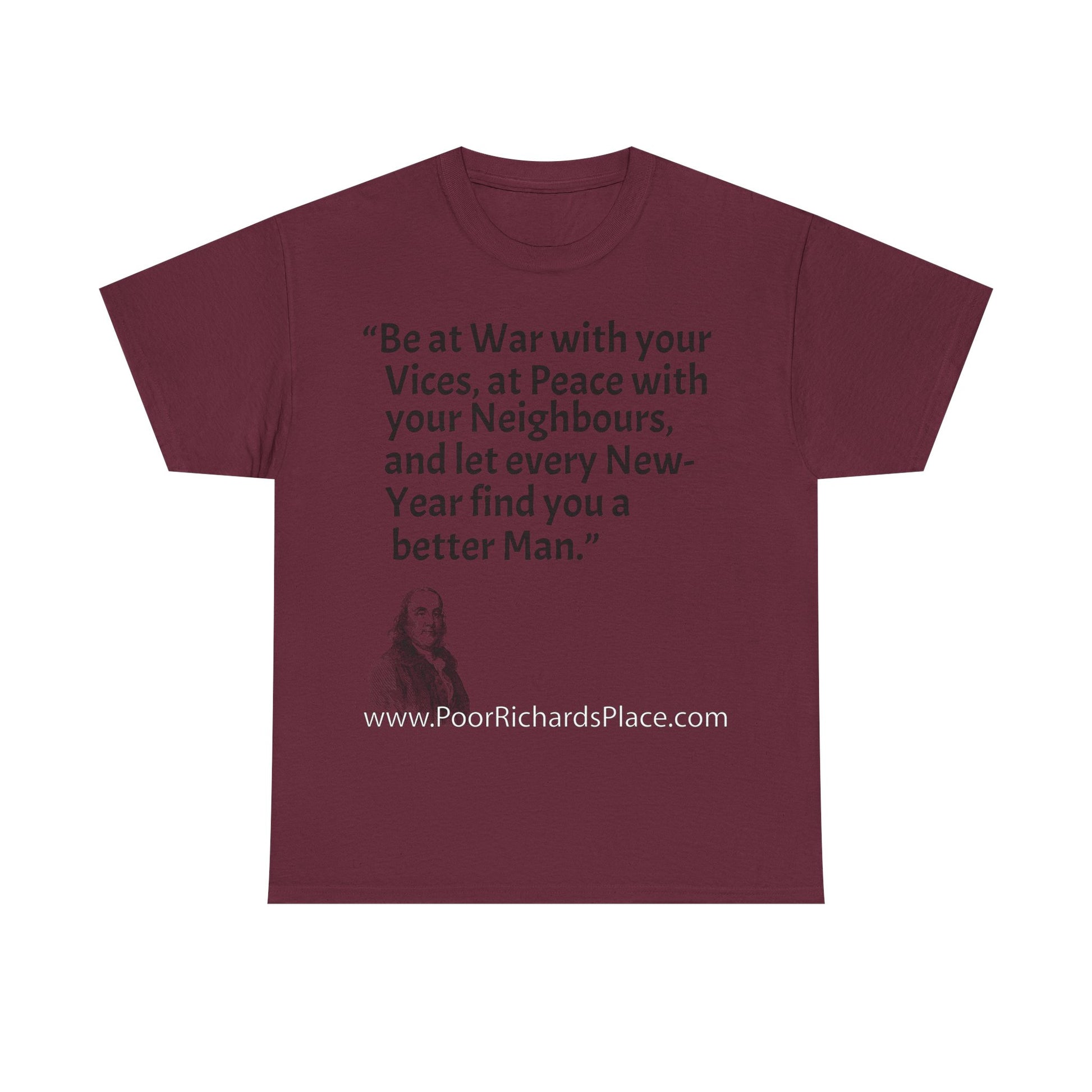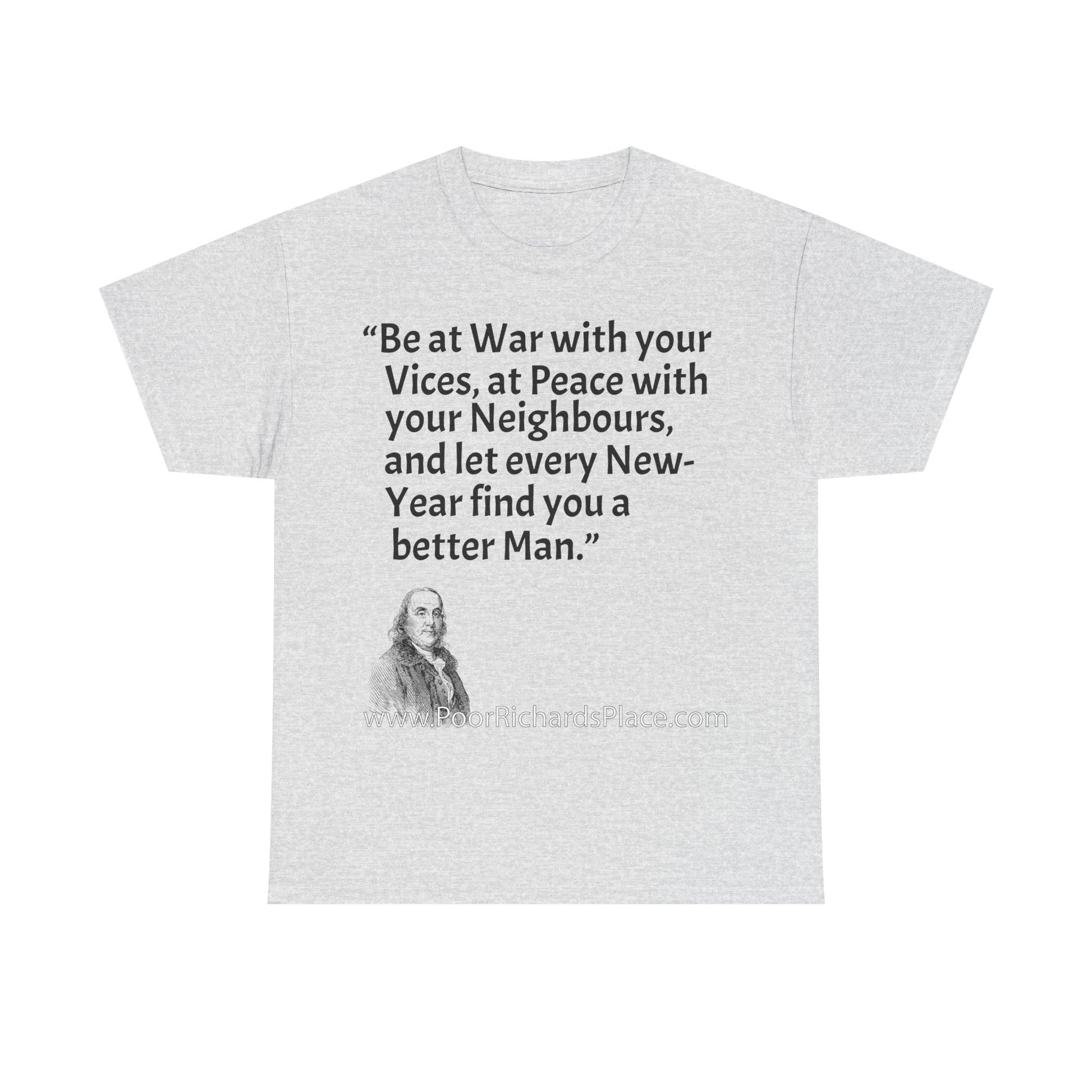 Unisex T-Shirt - Poor Richard Says Be at War with your Vices, at Peace with your Neighbours, and let every New-Year find you a better Man