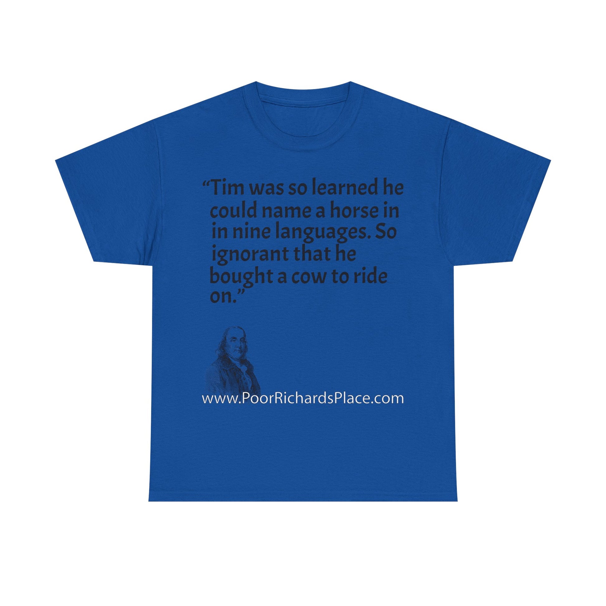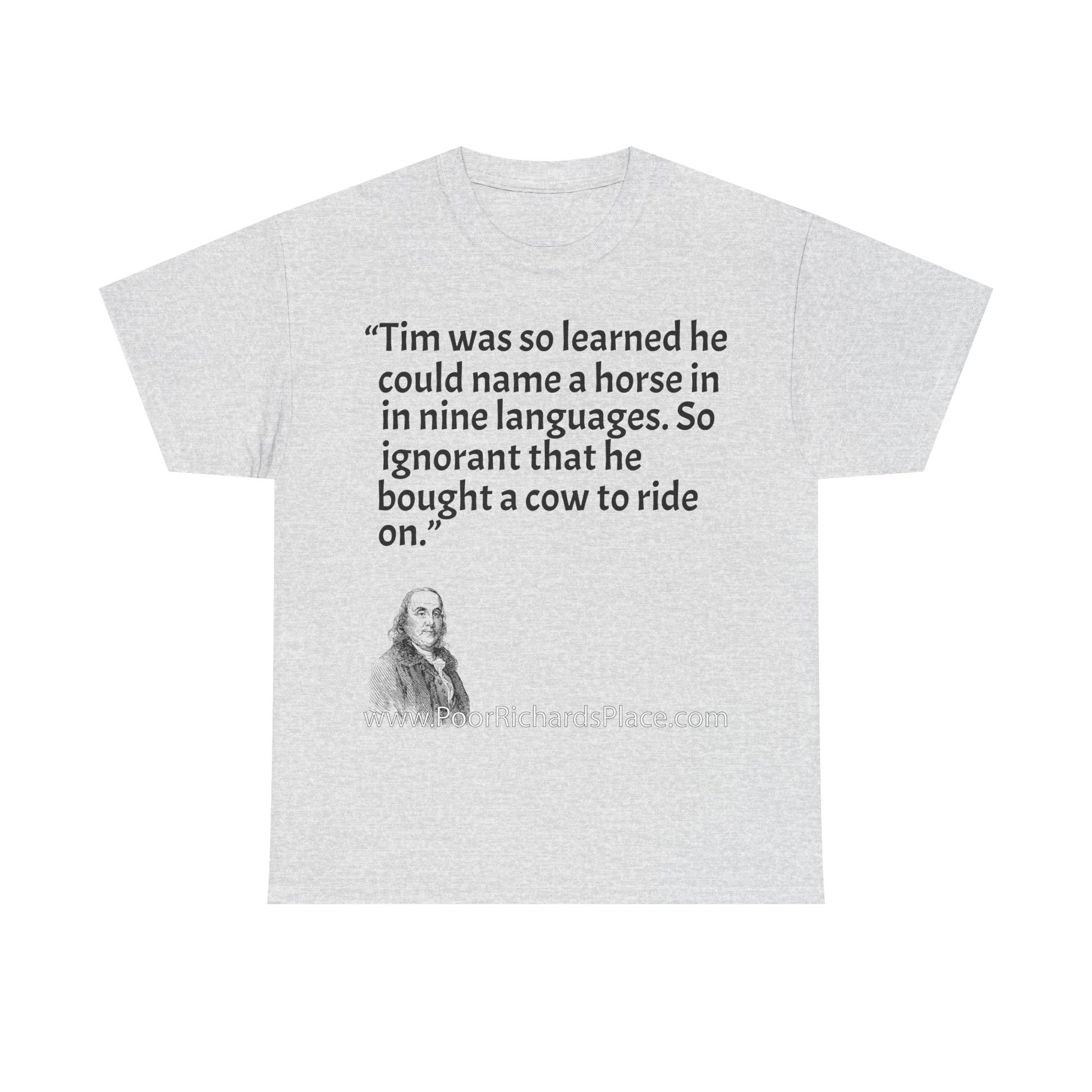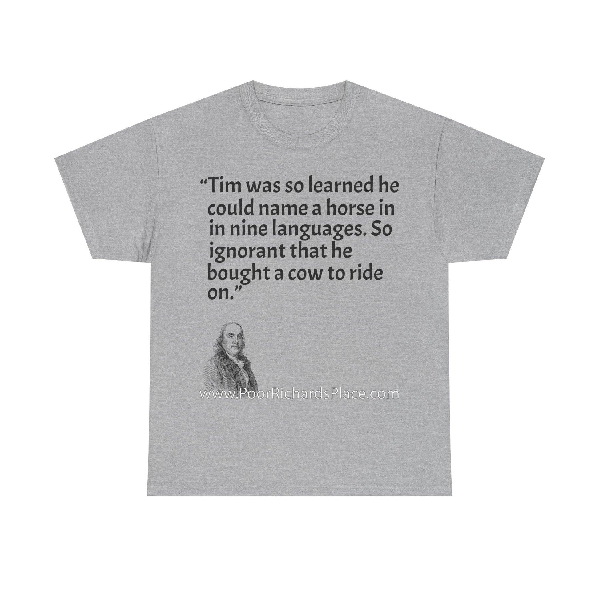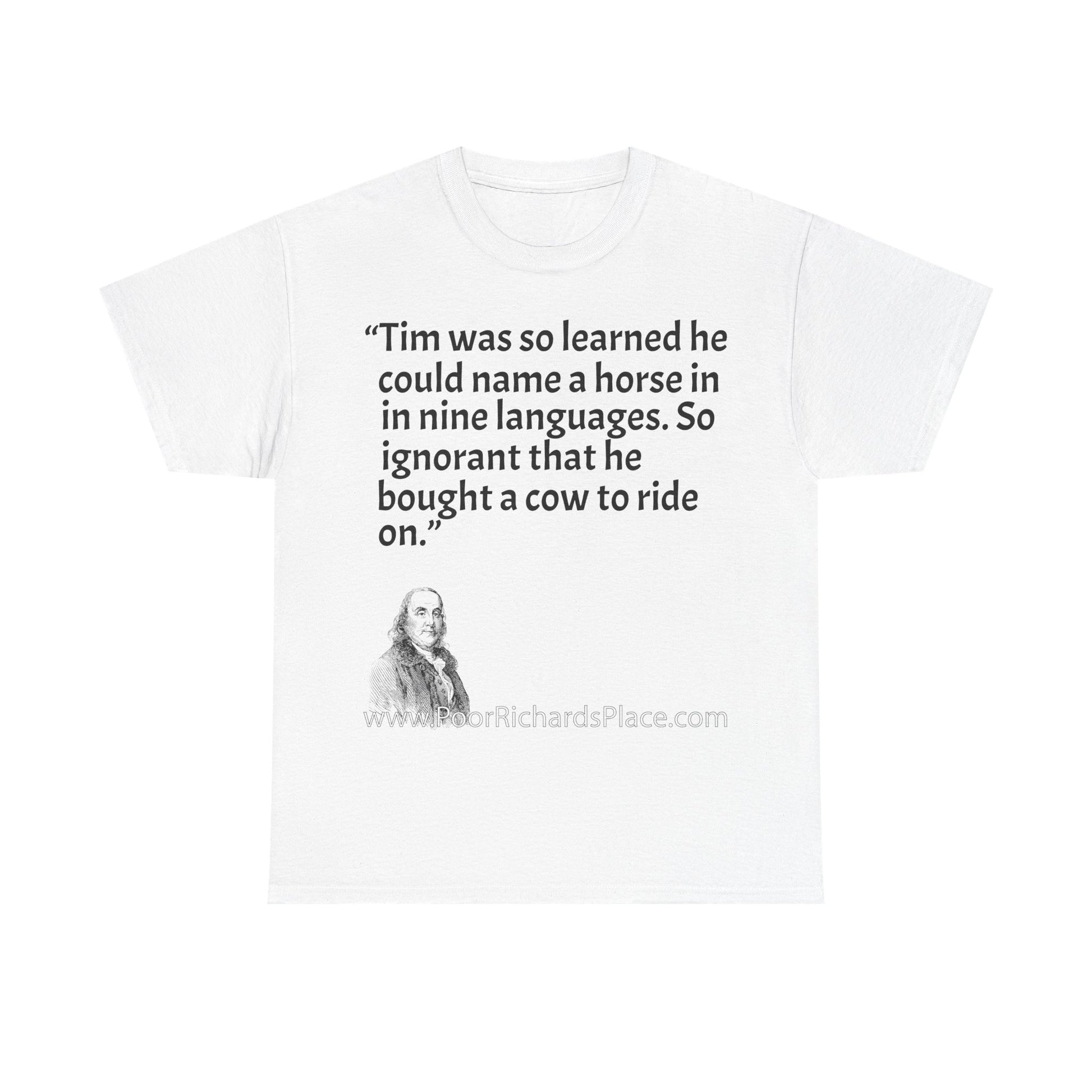 Unisex T-Shirt - Poor Richard Says Tim was so learned that he could name a horse in nine languages. So ignorant that he bought a cow to ride on