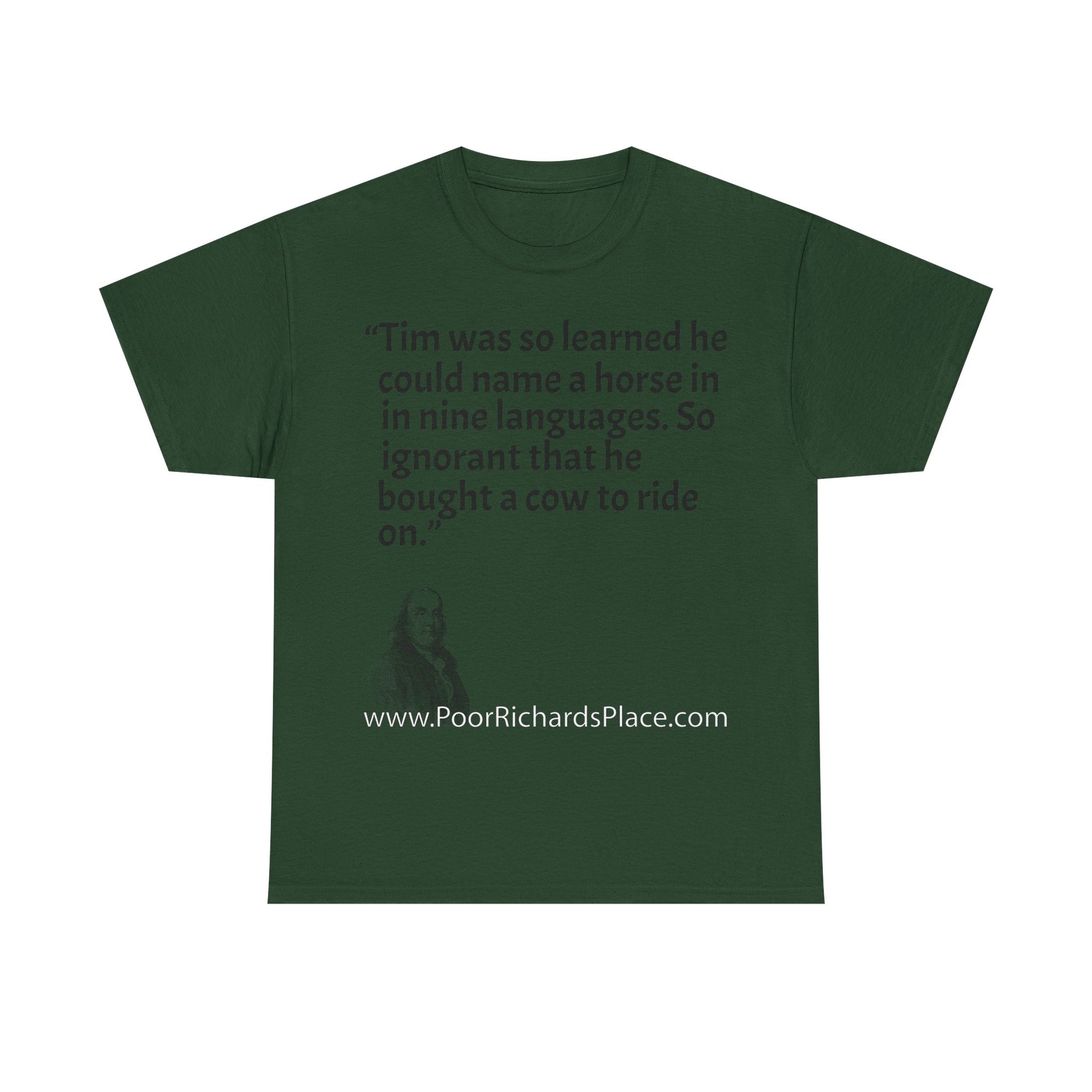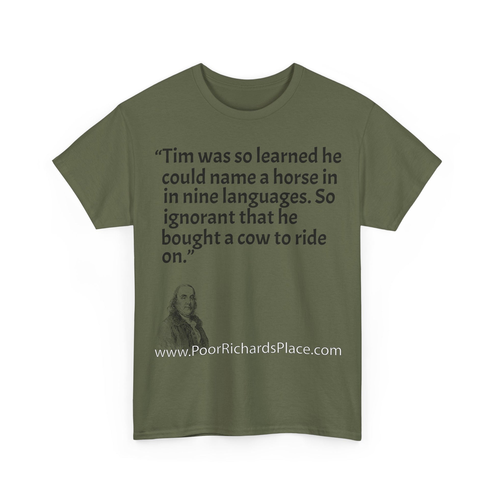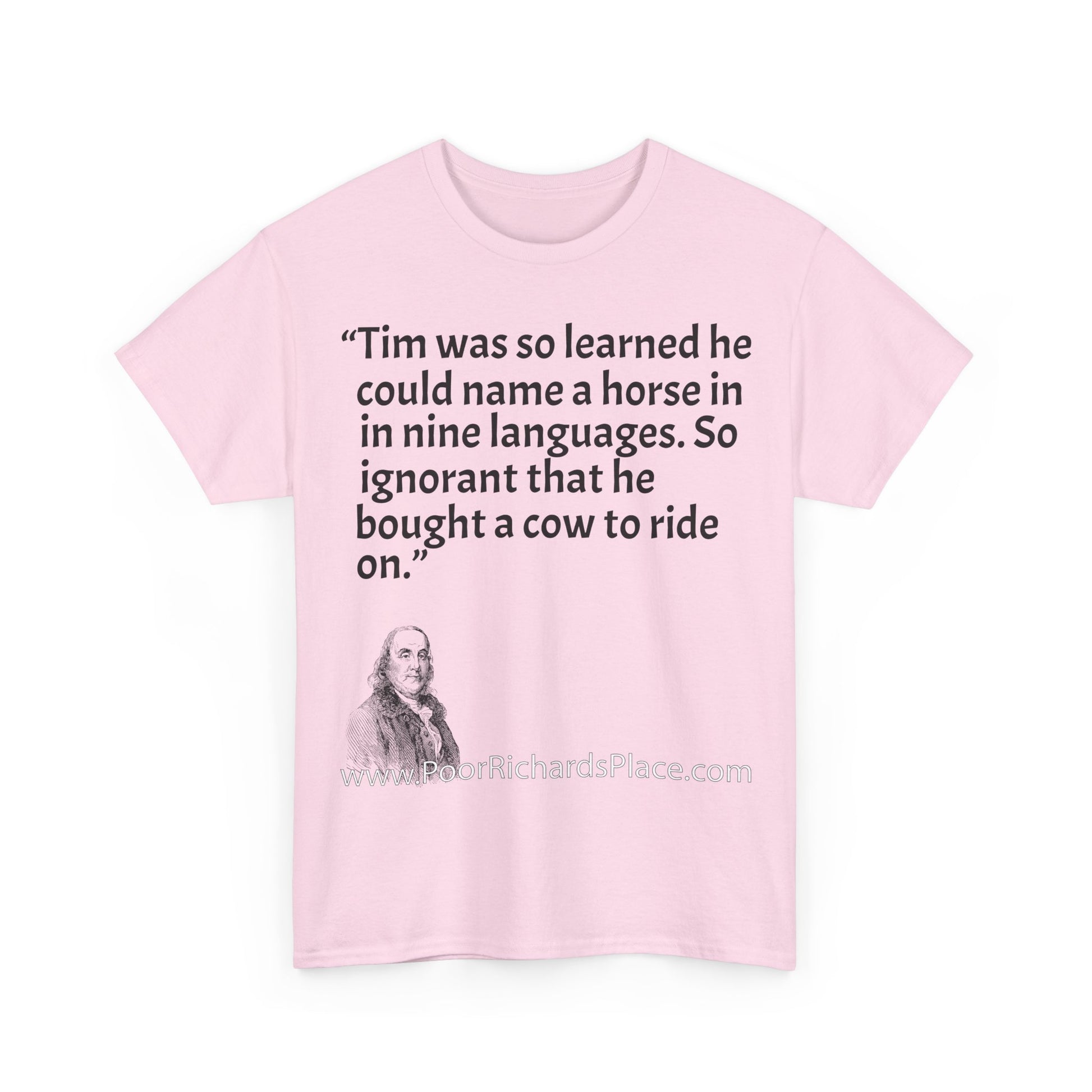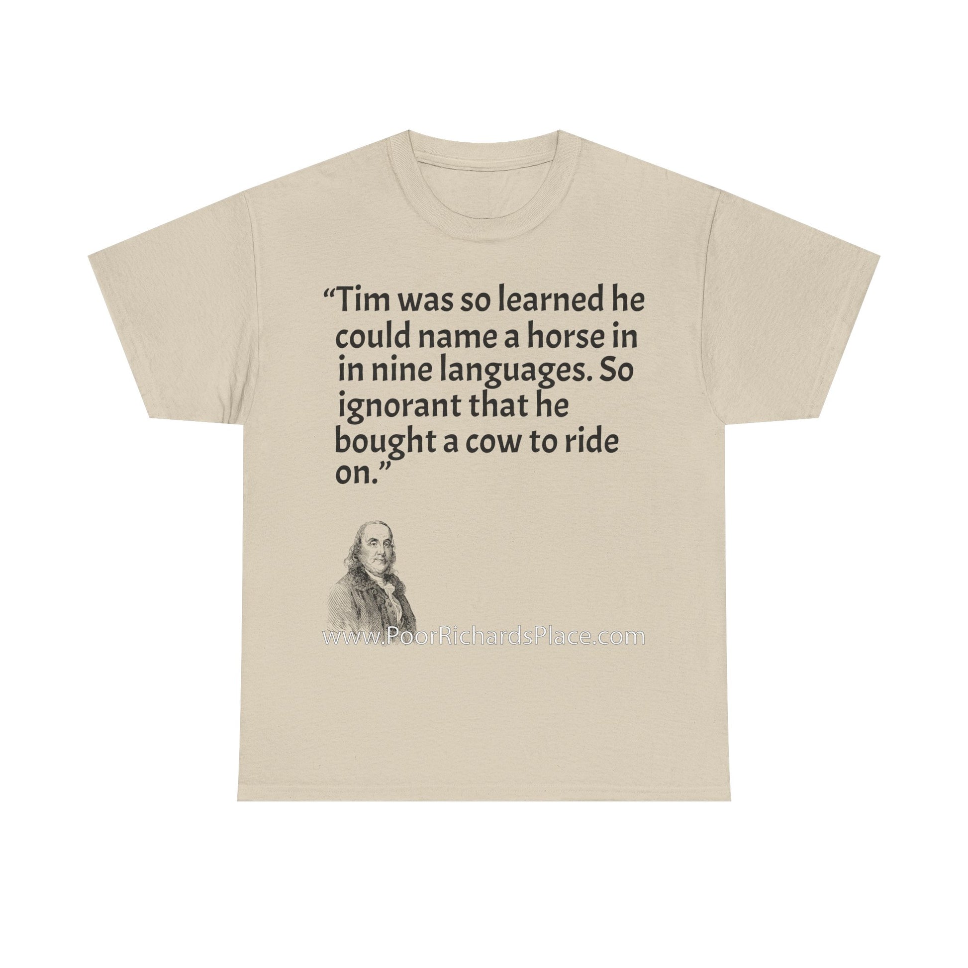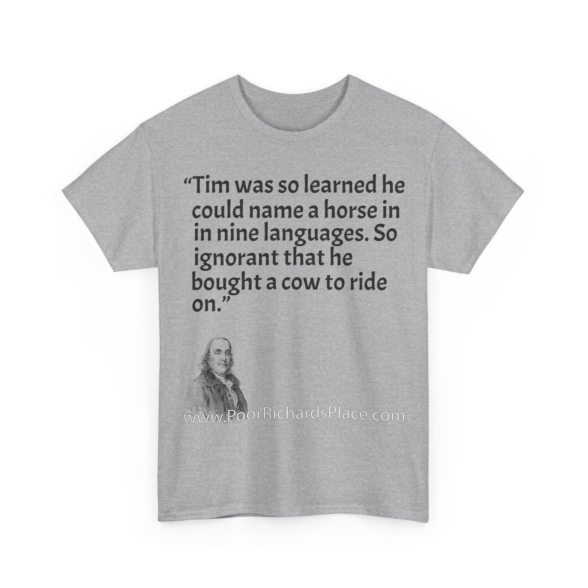 Unisex T-Shirt - Poor Richard Says Tim was so learned that he could name a horse in nine languages. So ignorant that he bought a cow to ride on
